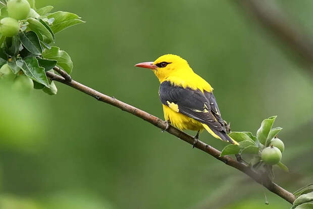 Иволга — довольно крупная птица (если сравнивать с тем же щеглом) и действительно очень яркая, но увидеть ее среди листьев не так просто. Куда проще услышать мелодичную, хотя и немного однообразную песню. А еще иволга умеет мяукать, как кошка, которой наступили на хвост, — такой звук она издает, когда чем-то встревожена.
